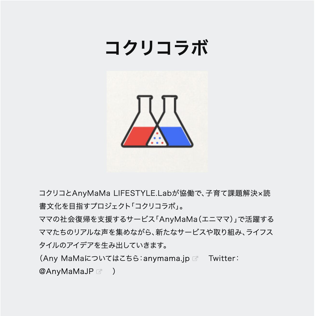 子育て、読書に関する課題を解決するために生まれた講談社の新メディア「コクリコ」とAnyMaMa(エニママ)は協働プロジェクト「コクリコラボ」を立ち上げました。
