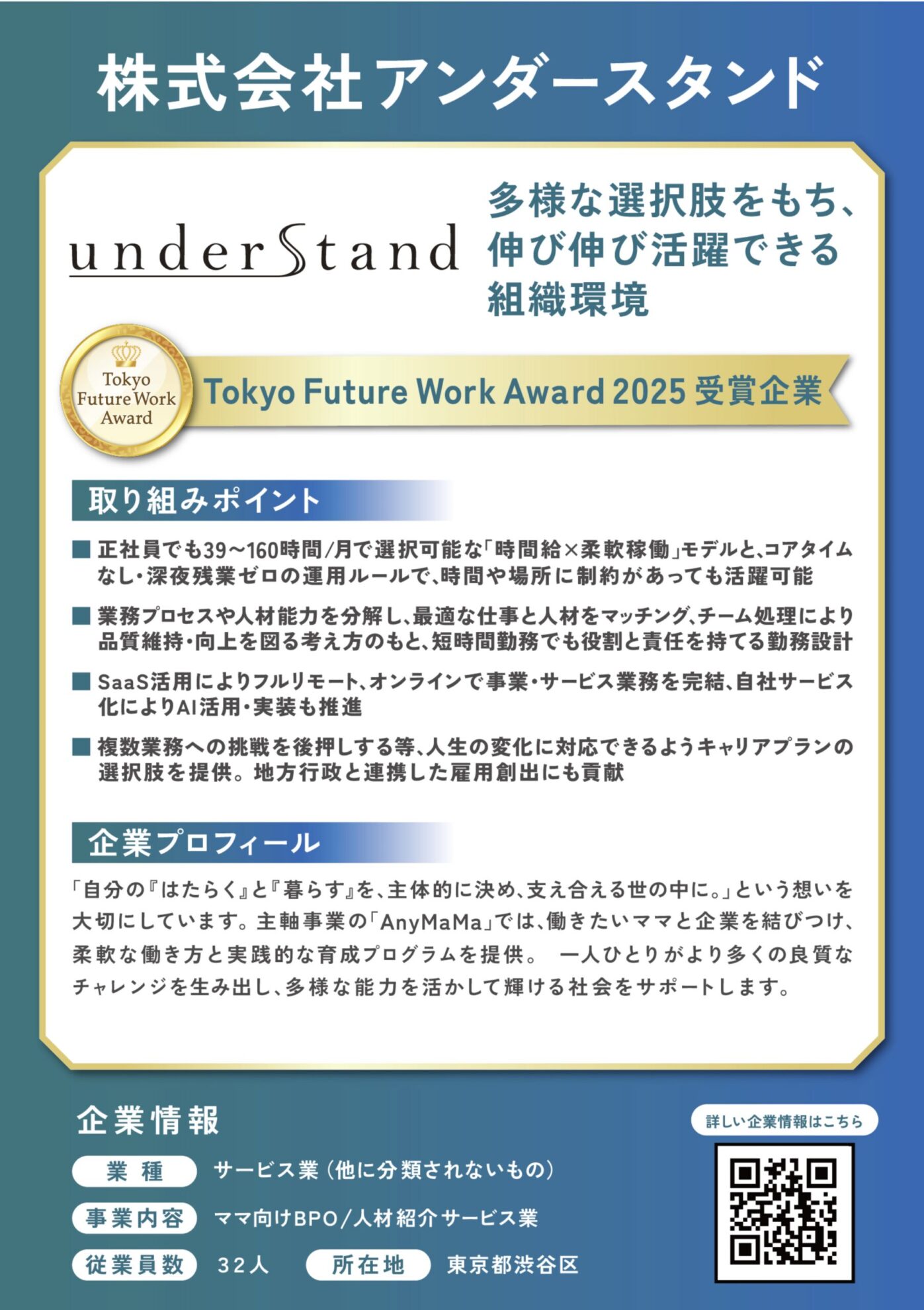 AnyMaMa(エニママ)を運営する株式会社アンダースタンドは、東京都が主催する「Tokyo Future Work Award 2025」において、奨励賞を受賞しました。