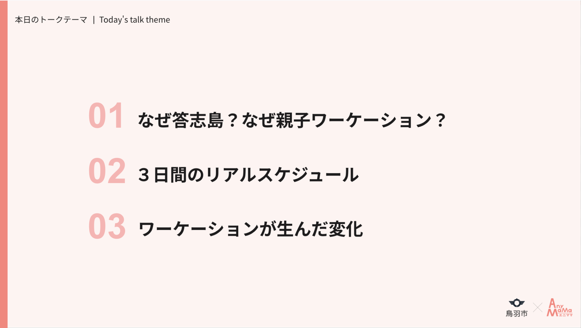「親子ワーケーション報告イベント」では、鳥羽企画財政課 木下翔平氏、実際に親子ワーケーションを体験したエニママアンバサダーの【あかねさん】にご参加いただき、当社取締役 河田和子よりトークセッション形式で現地の様子を伺いました。