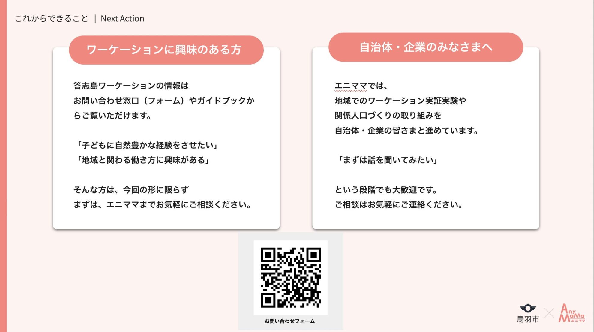 エニママでは、親子ワーケーションという旅の形は、子どもの成功体験を増やしたい子育て世代と、地域の魅力を深く知ってほしい自治体とをつなぐものになると感じています。