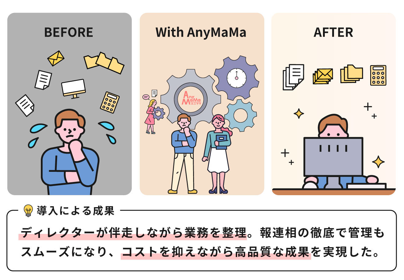 そこで出会ったのが「エニママ」でした。時間単位で多様なプロフェッショナルが支援してくれる仕組みで、ディレクターが伴走しながら業務フローを整理してくれたことで、業務が安定しました。