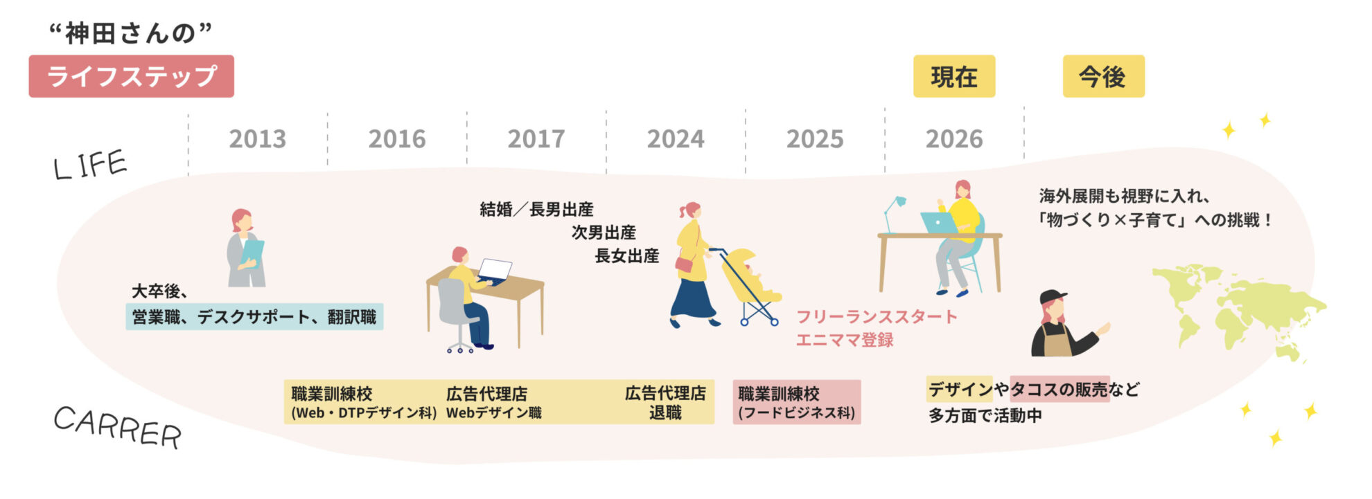 子育てと自分の「好き」を両立させている神田さん。エニママを働き方を軸に加えたことは、不安定なフリーランスの悩みを解消するだけでなく、夢を実現するための確かな実力を磨くステップにもなっています。