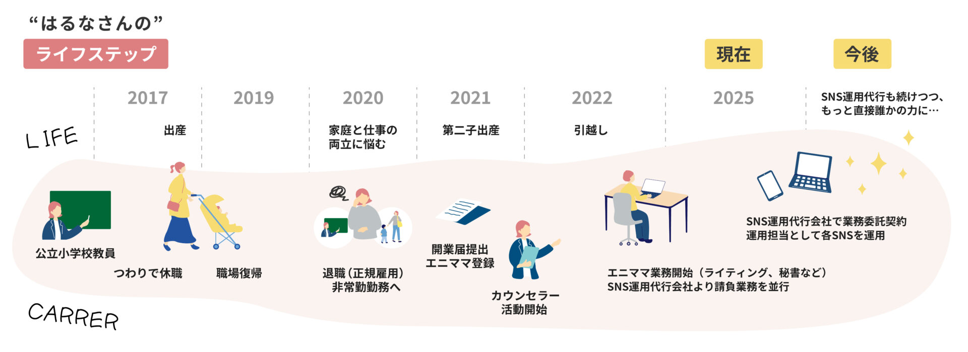 もっと将来的には、カウンセラーとして活動するなどで、直接的に困っている誰かの力になりたいと思っています。その人が悩んだ時に、私の経験を通して背中を押すような活動をしていきたいなと思っていて。たとえば、私は働き方と家族との時間との両立だけでなく、婚活などでも悩みを抱えて、それを乗り越えてきた経験があります。この道のりも、今悩んでいる人にとって助けの一つになるのかもしれないって考えているんです。