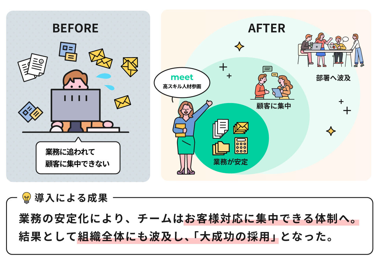 紹介された方達は数・質ともに想定以上。結果として当初予定していたポジションにとどまらず、他部門とも連携し、複数ポジション・複数名の採用へと展開しました。業務効率と対応品質が向上し、サービス利用の感想を一言で表すなら「大成功の採用」でした。