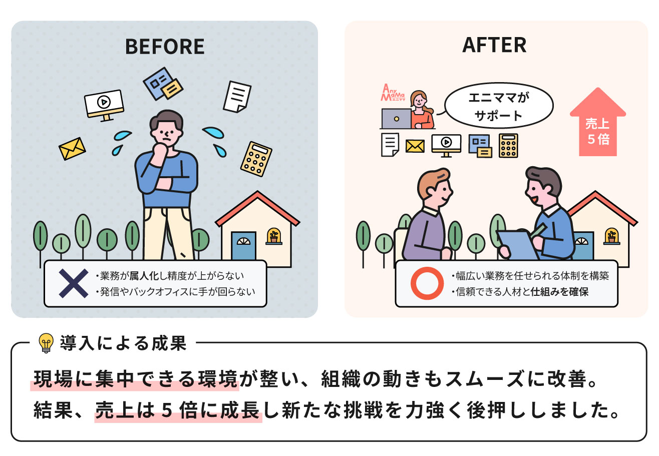 結果として、現場に集中でき、売上は5倍になり、組織全体の動きもスムーズになったと実感しています。 |