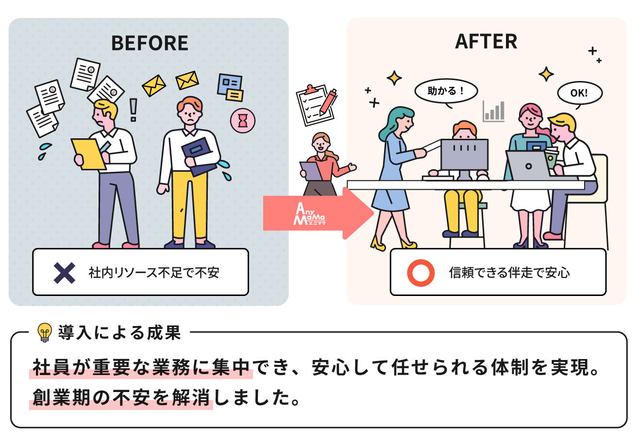 社内体制が足りない状況や、短期間で対応すべき業務が発生した際に、エニママのようなパートナーに助けてもらうことで、事業に集中できる環境が整います。温かみのあるサービスなので、安心して相談できると思います。特にスタートアップや小規模な組織の方にはぜひおすすめしたいですね。