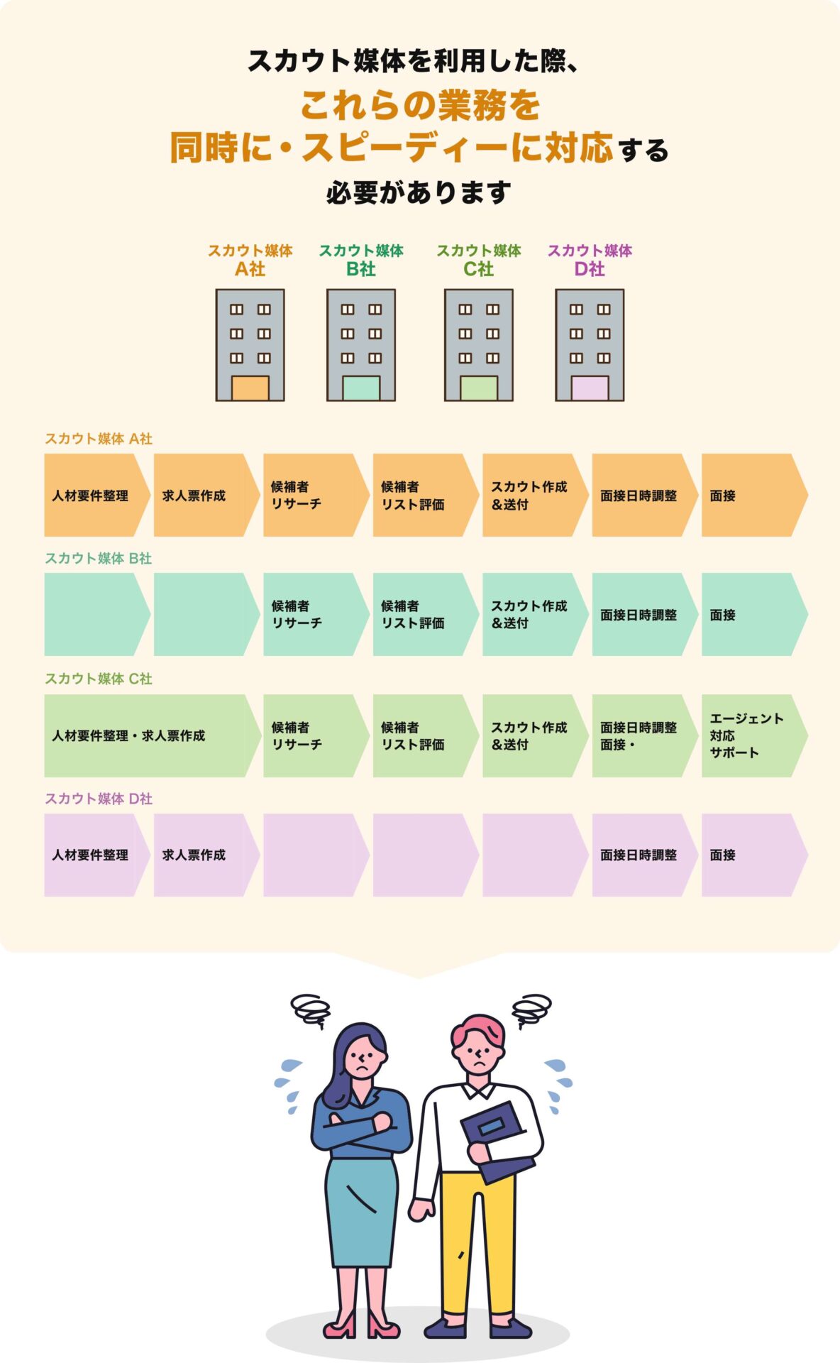 スカウト媒体を活用した採用では、「希望する人材の要件の方をひたすら探して、メッセージを送り、返信に柔軟に対応して、スムーズに面談を調整する」という一連の運営を不定期×スピード感を持った対応をしなければいけません。