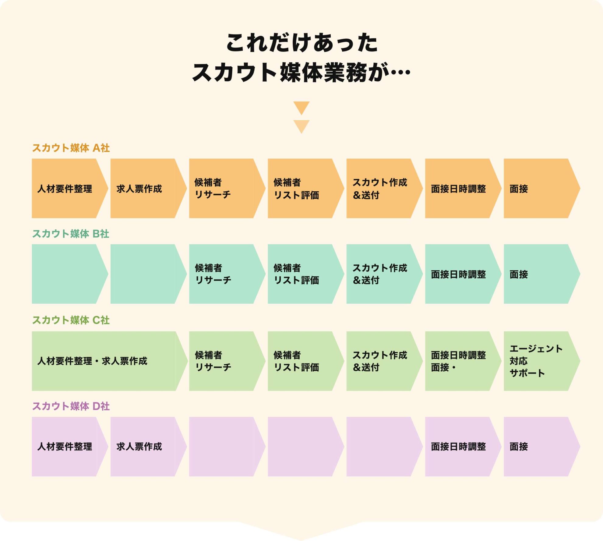 そこで、Wantedlyやビズリーチ、Greenに代表される「ダイレクトリクルーティング」「スカウト採用」のサービスを利用を検討するものの「とにかく、手間が命」な手法のため、多忙な新規事業担当者やスタートアップ企業では「自分たちではやりきれないかも・・・」という悩みも。