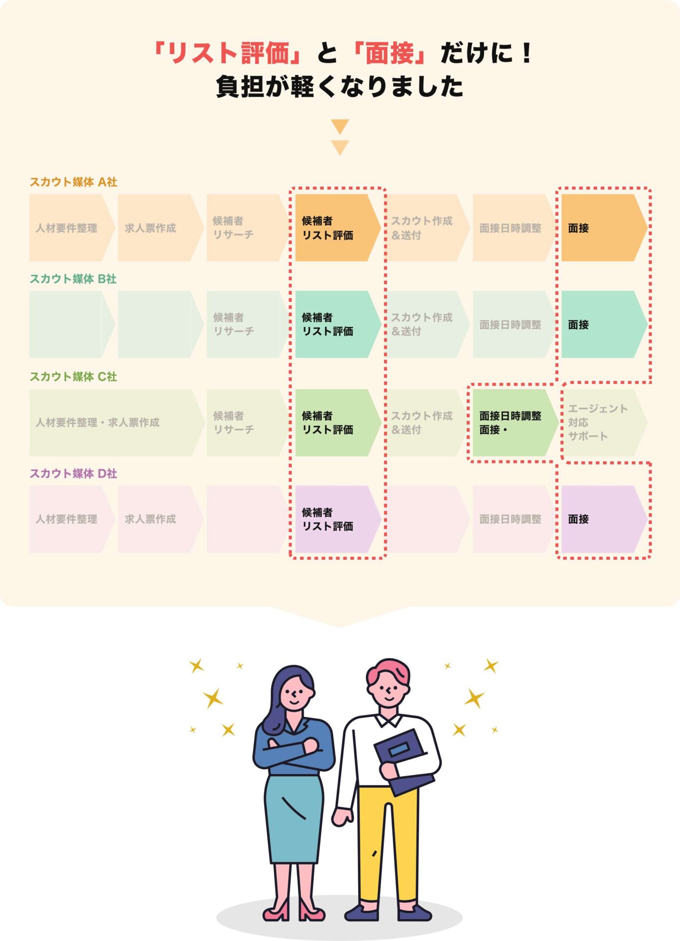 担当者は人材リストをチェックし、アプローチする人材を決め、面談するだけに