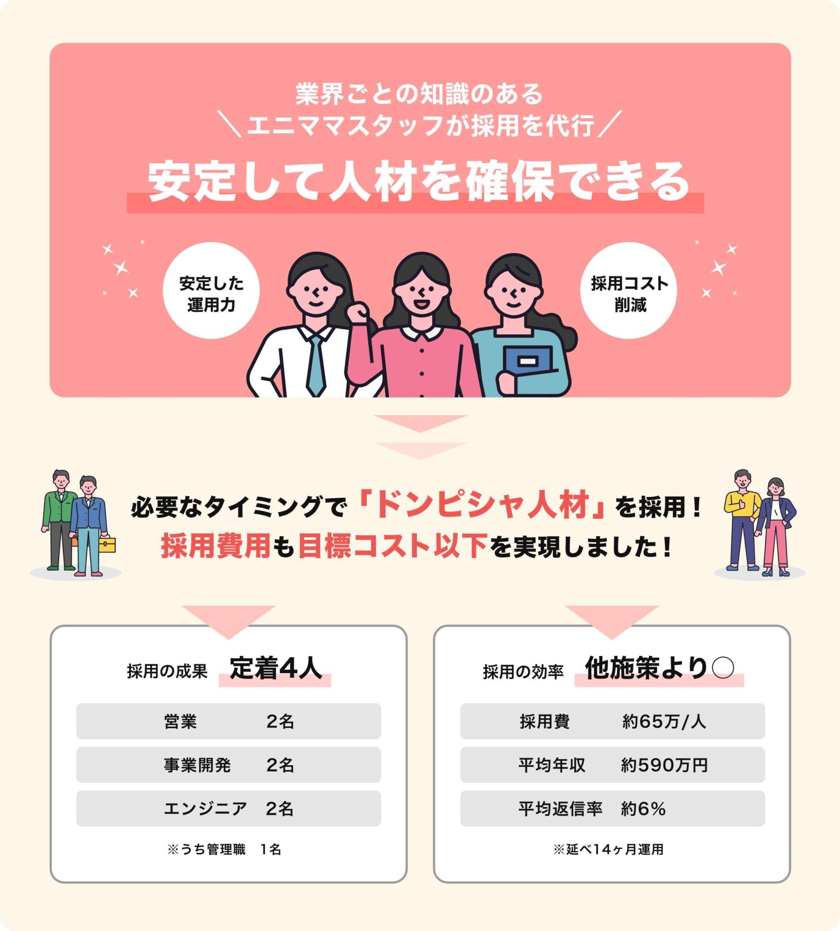 企業さまは、基本的には、私たちの提案した候補者の方に○✖️をつけ、必要に応じフィードバックを頂くのみで、あとは面接が決まった方を待つばかりです。 結果、D社様では4名の採用が決まり、一人当たりの採用費用は約65万円ほどとなりました。