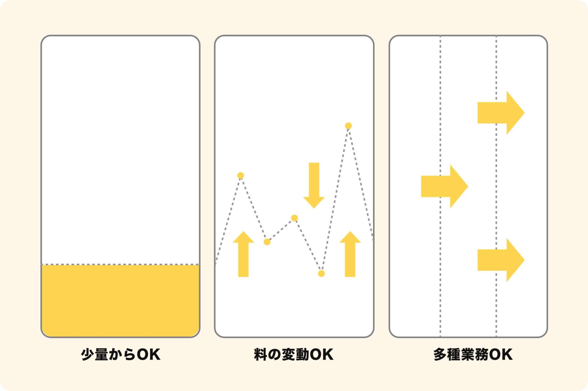 少ない量からスタート、月による運営量の変動、複数職種や媒体への拡張縮小もOK
