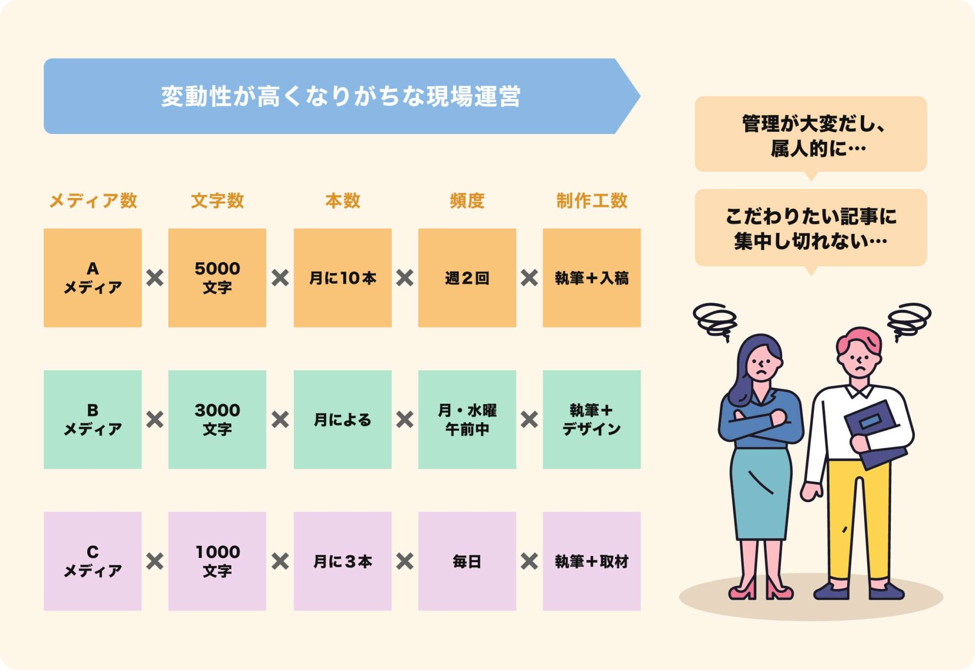 さらに、記事コンテンツは1本あたり5000字のSEO記事が毎月数十本ほど必要。この文字数の記事を高いクオリティで納品できるライターはなかなか見つからず、ライターの入れ替わりも多く起きていました。