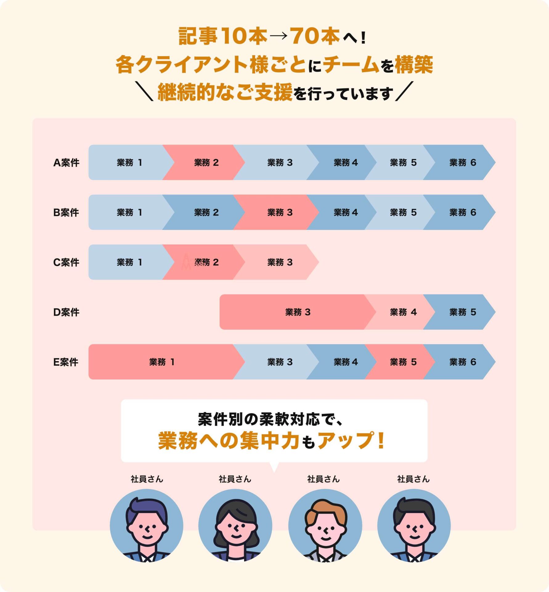 ご依頼開始時は10本程度からスタートしたA社も、今では毎月70本ほどの継続的な記事制作を委託いただいています。エニママの特徴は、各クライアント様ごとにチームを構築し継続的なご支援をすること。チーム体制での支援には下記のメリットがあります。