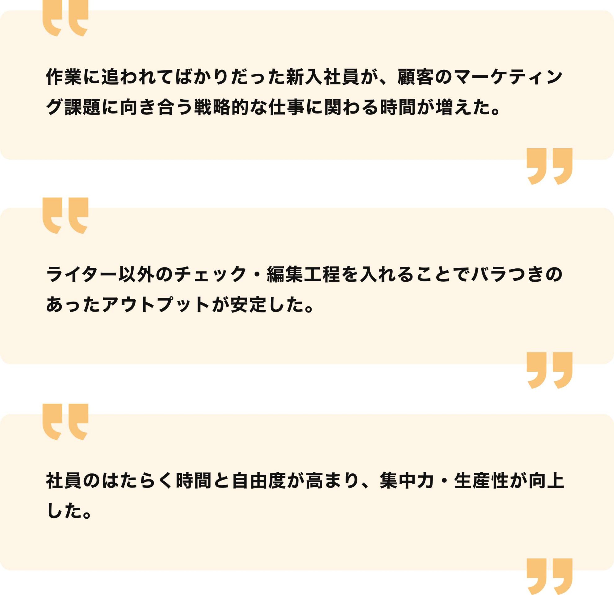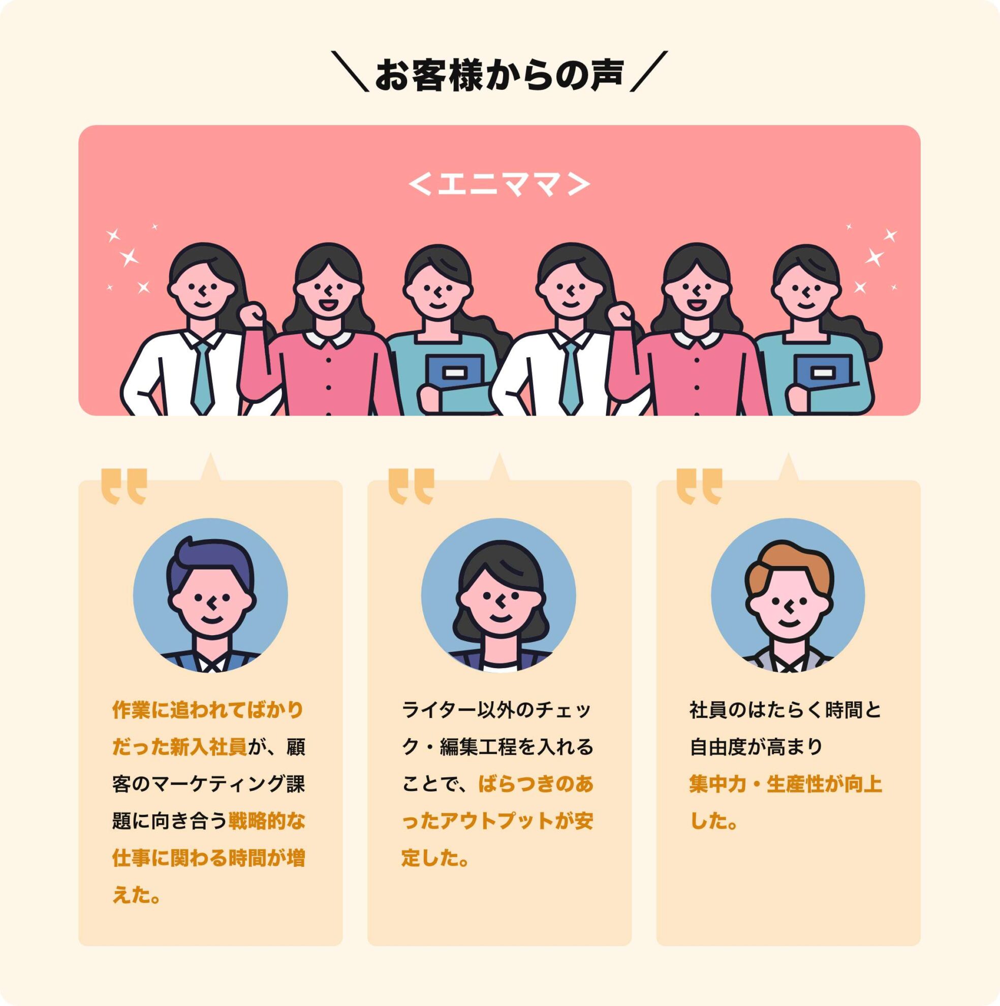 これまで自社の社員が対応していた「ライター人材の調達」「進行管理」「記事の品質管理」をエニママに委託いただいたのです。
