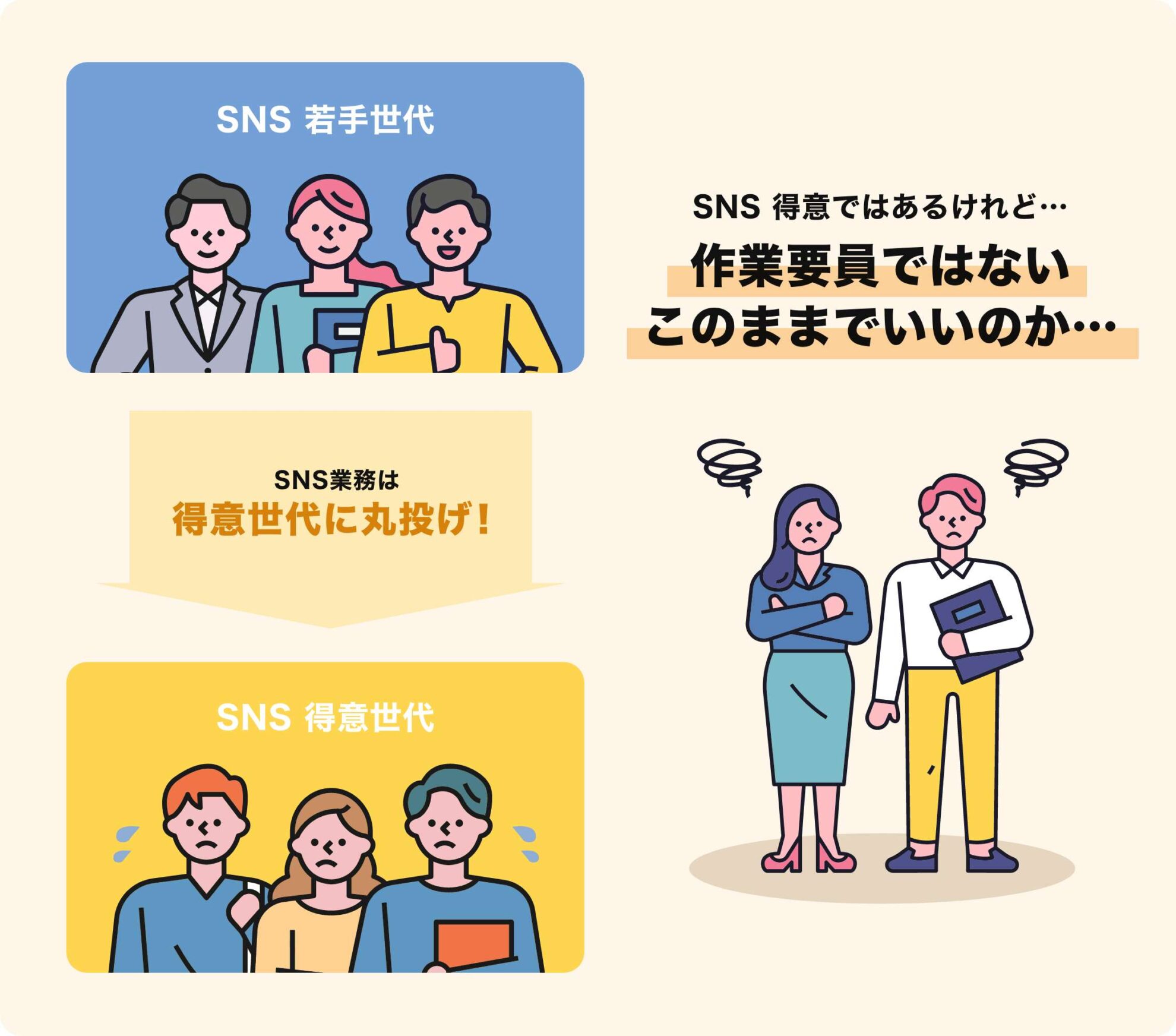 InstagramやTikTokなど若い世代が利用するSNSの運用は、インターン生や若手社員に任せっきりになりがち。B社でも、そのほとんどを若手社員が担っていました。