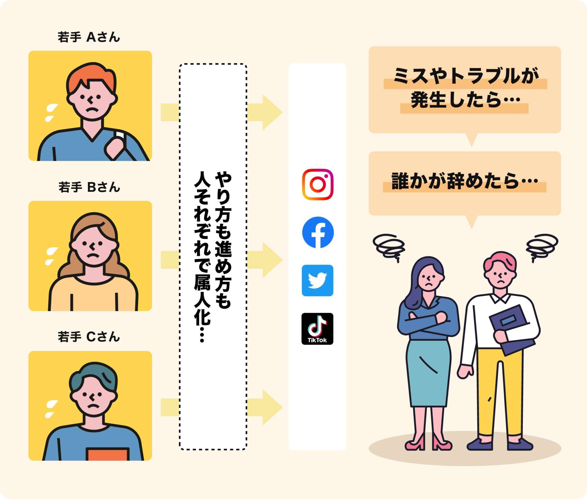 スタートアップ企業ということもあり、顧客への企画提案からSNSの運用まで、全ての雑務を含めて若手社員が一人で回すことも多く、気がつけば若手社員に丸投げ、属人化状態となっていたのです。