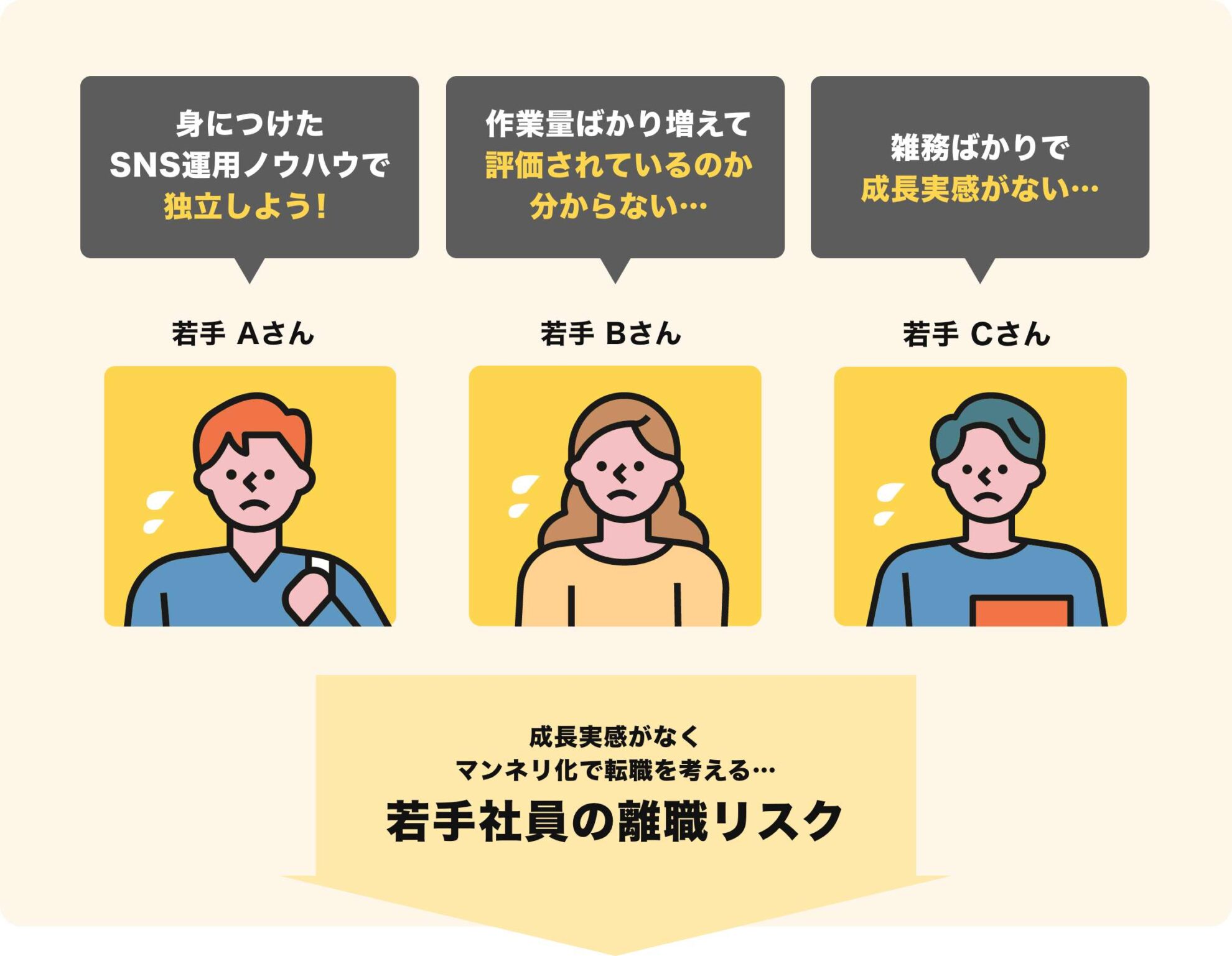 成長実感が感じられない社員は、ノウハウを身につけたタイミングで転職を考えるケースも多いでしょう。「ベンチャーに入社したのに、結局は雑務ばかりでやりたかったことができない」という状況は社員のモチベーションを奪ってしまいます。SNS運用ノウハウを身につけた優秀な社員が、定着せずに離職してしまうのは企業にとって大きな損失です。